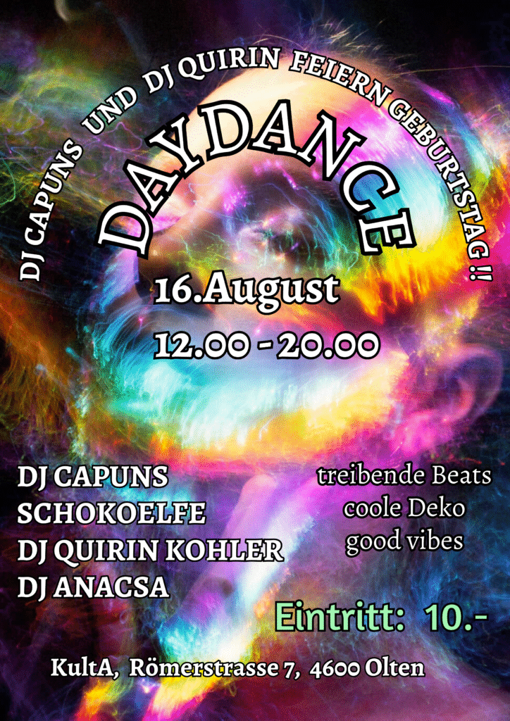 Am 16.08.2025 feiere ich mit euch meinen Geburtstag mit einem DayDance von 12.00 - 20.00 im KultA in Olten !!